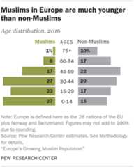 As of 2016, there is a 13-year difference between the median age of Muslims in Europe (30.4 years of age) and non-Muslim Europeans (43.8). Because a larger share of Muslims relative to the general population are in their child-bearing years, their population would grow faster, even if Muslims and non-Muslims had the same fertility rates.