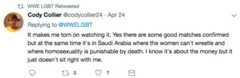 Prominent LGBT+ activist Peter Tatchell said that that the tournament’s location in “the bastion of illiberalism” makes WWE less accessible for LGBT+ fans.
