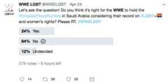 Twitter account WWE LGBT asked its queer fans what they thought about the tournament’s controversial location, with 64 percent stating that they disagreed with it taking place in Saudi Arabia.