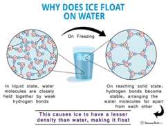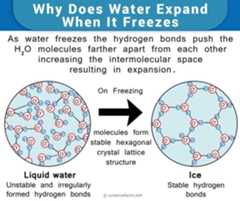 The water molecule, consisting of 2 atoms of hydrogen and one of oxygen, forms a Mickey Mouse head-like structure such that the ears are the hydrogen atoms and the oxygen atom represents the head. The oxygen atom side of the molecule is slightly negative, while the hydrogen atoms side has a slightly positive charge. This makes the water molecules drawn towards each other, forming hydrogen bonds. Upon freezing, the molecules set themselves in a very open arrangement that contains more space than the water in the liquid state. Hence, water is said to expand upon freezing and becomes less dense. On the other hand, it contracts on thawing, much unlike most other liquids.