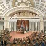 For more than 160 years, the Senate has occupied its current Chamber in the United States Capitol. Measuring 114 feet long by 80 feet wide, and 36 feet from its floor to the highest point of its ceiling, the Senate Chamber retains an intimacy characteristic of a 19th-century legislative hall, while simultaneously meeting the needs of modern legislators. Mahogany desks and spittoons from that earlier era coexist with microphones, computers, and television cameras, linking today’s senators to their historical predecessors.