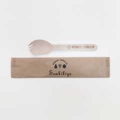 店舗でケーキ等を購入された際に提供していたプラスチック製のスプーン・フォークについて規格を見直しました。天然素材を使用したスプーン・フォーク兼用の「木製スポーク」に変更し、FSC認証の紙袋で1本ずつ個包装しております。