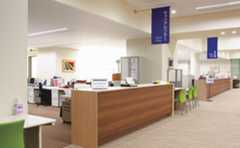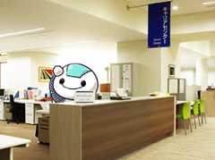キャリアセンターの事務室は中央教育棟1Fにございます。来客者の受付や、進路・就職全般に関わる事務手続きの受付を行っています。