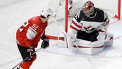 Switzerland's Gaetan Haas, left, scores his side's third goal during the Ice Hockey World Championships semifinal match between Canada and Switzerland at the Royal arena in Herning, Denmark, Saturday, May 19, 2018. (Petr David Josek/AP)