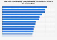 On October 9, 2025, the price of regular gasoline was highest in California, at around 4.66 U.S. dollars per gallon. This was some 1.4 dollars above the national average of 3.18 U.S. dollars. California's high motor fuel prices are largely determined by it being the U.S. state with the highest gasoline tax.