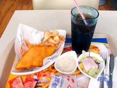 I placed my order - a Golden Yellow (金黃) number one set meal (NT$155), which came with a salad, drink, two battered and fried shrimp, one battered and fried fish fillet and one fried chicken strip - and was further impressed that Long John Silver's, at least this one, was doing its bit for the environment by using silverware and reusable glasses and plates.