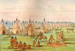 | In the Great Camanchee (sic) Village, near the Texas panhandle, circa 1840s, by frontier artist George Catlin. The scene, he notes, records but a small part of the extensive village. The "wigwam of the chief" is in foreground, and women are drying meat and working buffalo hides nearby. From Catlin 1926. |
