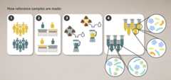 | NIST hired a contractor to recruit two groups of people to provide the stool samples. For their current reference material: vegetarians and omnivores (1). Each participant provided stool samples over the course of multiple days; the samples were frozen and stored. They also kept track of their food intake so that researchers knew what types of molecules to expect in the stool (2). The frozen stool samples were thawed, and each group’s samples blended together with some water to dilute the mixture (3). Researchers poured the mixture into one milliliter tubes. The blending process produces homogeneous contents, so each tube containeds the same mixture of molecules and other bacterial products. The tubes were frozen and packaged in boxes that each contained a few tubes from each group (4). |