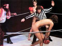 The climax of the show was a request for an audience volunteer to wrestle the top girl. The winner, to be decided by audience applause, would go home with a cash prize of $200. Without hesitation, Diane shot her hand up and dove into the mud. After a spirited battle, the ref solicited the crowd to see who won. When he turned to Diane, she lifted up her shirt and flashed her tits. No surprise, she walked away with the money. And from that night forward, Jon and Diane added mud wrestling to their foxy boxing spectacle.