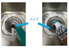 キッチンハイターをスプレーし、排水口の中にパイプクリーナを回し掛けて30分放置する。パイプの中を見て、汚れがひどく落ちていないようであれば、もう30分時間をおいてください。