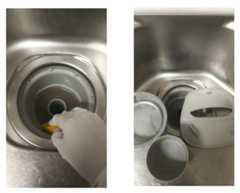 ゴミ受け内のゴミを除去し、キッチンハイターを全体にスプレーし、放置します。