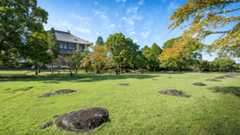 大仏殿北側の芝生のところに大きな礎石が整然と並んでいるのが見える。東大寺の大講堂のあったところで、天平のときに創建されて以来、講堂は三たび火を受け、再建されず今日に至っている。