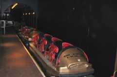 Because the ride was totally hidden from view, guests didn’t know what to expect until they had ridden it, so for first time riders the queue was quite intimidating not knowing what they were queuing for. In the station was the first time guests could see the trains with passengers sitting in twos, one behind the other rather like sitting on a sledge. Spiralling upwards the train climbed fairly high, before a voice said ‘sit back – hold tight’ and then guests were plunged down large drops and around tight corners