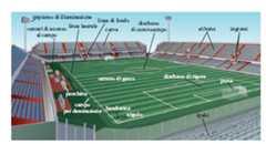 Le gare si disputano all’aperto su un campo di forma rettangolare (v.fig.) della larghezza minima di 45 m (massima di 90 m) e della lunghezza minima di 90 m (massima di 120 m). Per le gare internazionali la larghezza minima del campo deve essere di 64 m (massima di 75 m), la lunghezza minima di 100 m (massima di 110 m). Le linee che delimitano ilrettangolo digioco sono chiamate linee di fondo (o linee di porta), quelle dei lati minori, e linee laterali quelle dei lati maggiori. A ciascun vertice del rettangolo è piantata un’asta con una bandierina. A metà campo, parallelamente alle linee di fondo, è tracciata lalinea centrale del campo, il cui centro coincide con il centro di uncerchio, di raggio di 9,15 m, detto cerchio del centrocampo. Lungo le linee di fondo sono collocate le porte, formate da due pali verticali distanti fra loro 7,32 m e riuniti da una sbarra trasversale (traversa) posta a 2,44 m da terra; la porta è chiusa dietro e lateralmente da unarete che ha lo scopo di trattenere il pallone, eliminando possibili dubbi su un’avvenuta segnatura. Davanti a ciascuna porta è delimitata una zona, dettaarea di porta. Alla distanza di 16,50 m da ciascun palo sono tracciate due linee perpendicolari a quella di fondo e della lunghezza pure di m 16,50, congiunte da un’altra linea parallela al fondo campo: lospazio così delimitato si chiama area di rigore.