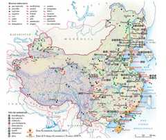 Non meno vistosa è la ricchezza della C. in minerali utili (fig. 2), dopo che i decenni a cavallo tra i due secoli hanno visto moltiplicarsi le scoperte minerarie. Anzitutto, la C. è di gran lunga il primo produttore mondiale di carbone (quasi 2 miliardi di t nel 2006) e probabilmente detiene le maggiori riserve non utilizzate. L’industrializzazione della seconda metà del secolo scorso si è basata quasi esclusivamente sul carbone, il che ha comportato costi ambientali e sanitari elevatissimi, specialmente nelle aree urbane industrializzate; dagli ultimi anni del Novecento una maggiore disponibilità di idrocarburi e soprattutto dienergia elettrica ha consentito una diversificazione crescente delle fonti energetiche; i problemi derivanti dall’impiego del carbone rimangono però molto gravi, come gravi, in generale, sono i livelli di inquinamento delle acque e dei suoli.