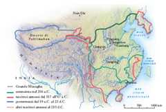 La guerra civile che seguì la suamorte si concluse con l’affermazione della dinastia Han, che completò la conquista del Sud e diede inizio all’espansione cinese in Asia centrale (fig. 3), con notevole impulso dei traffici. In questo periodo penetrò dall’India il buddhismo, che presto si diffuse largamente. Alla fine degli Han la C. si divise in 3 Stati: Wei al Nord, Wu al Sud, Shu Han nel Sichuan. L’ultimo dei Wei fondò la dinastia Jin (256-420), che nel 280 riuscì a riunificare il paese, prima di perdere la capitaleLuoyang e parte dei territori sotto l’attacco dei Barbari, dopo il quale la C. restò divisa tra Sud imperiale, con capitale Nanchino, e il Nord, dominato da dinastie prototurche e prototibetane. La C. venne nuovamente riunificata sotto i Sui (581-618), che ripresero l’espansione ma riportarono gravi insuccessi in Corea; ai Sui succedettero i Tang (618-907), con i quali la C. raggiunse il massimo splendore politico-culturale. Le due principali figure della dinastia furono gli imperatori Taizong (626-649) eXuanzong(712-756). Il primo sottomise i Turchi e condusse una serie di imprese militari versooccidente. Il secondo è famoso soprattutto per il grande sviluppo chepittura e letteratura ebbero alla sua corte.