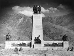 The monument was dedicated during Utah's pioneer centennial celebration in 1947. The granite structure stands sixty feet high and eighty-six feet long. It memorializes, in bronze sculptures, the Mormon pioneers as well as the traders, trappers, explorers, and others who were instrumental in the development of the West. The figures atop the center pedestal are Brigham Young in the center, Heber C. Kimball to the north, and Wilford Woodruff to the south. The three were prominent leaders during the early days of the Mormon Church.
