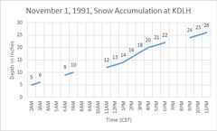 This graph shows the snow accumulation at KDLH on November 1, 1991. Notice the 3-hour period of 2" per hour snowfall rates between 1PM and 4PM.
