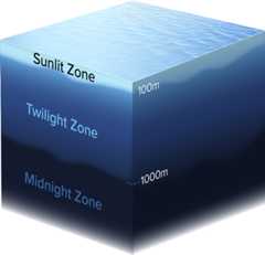 In most areas, the ocean floor lies 4,000 to 6,000 meters (13,000 to 20,000 feet) below the surface, but deep ocean trenches can extend this depth to 11,000 meters (36,000 feet). The region extending from 6,000 to 11,000 meters is called the hadal, or hadalpelagic, zone after Hades, the Greek god of the underworld. This zone occurs only in trenches; combined across all oceans, they make up an area about the size of Australia. The hadal zone is characterized by extreme depth and pressure, temperatures that hover just above freezing, and complete darkness—at least in terms of light from the sun. Bioluminescence allows organisms in the ocean depths to communicate. Walls of trenches are steep and descend through a gradient of depths and pressures, creating a variety of habitats along the slope.