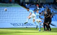 Ruben Dias of Manchester City scores his team’s first goal during the Premier League match between Manchester City and West Ham United at Etihad Stadium on February 27, 2021 in Manchester, England.