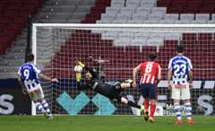 Jan Oblak of Atletico de Madrid saves a penalty from Joselu of Deportivo Alaves during the La Liga Santander match between Atletico de Madrid and Deportivo Alavés at Estadio Wanda Metropolitano on March 21, 2021 in Madrid, Spain.