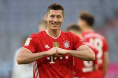 Robert Lewandowski of FC Bayern Muenchen celebrates after scoring their side’s fifth goal during the Bundesliga match between FC Bayern Muenchen and Borussia Moenchengladbach at Allianz Arena on May 08, 2021 in Munich, Germany.
