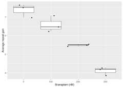 library(ggplot2)library(dplyr)metrics_grouped_df|>left_join(metadata, by=join_by(unique_id))|>filter(day>0,modal_peak_signal>500)|>ggplot(aes(as.factor(treatment),average_repeat_change))+geom_boxplot()+geom_jitter()+labs(y="Average repeat gain", x="Branaplam (nM)")