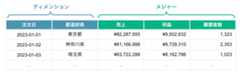 SELECT order_dateAS"注文日",SUM(sales)AS"売上",COUNT(DISTINCT customer_id)AS"購買顧客数"FROM ordersWHEREYEAR(order_date)=2023GROUPBY order_date上記のSQLの結果、データの利用者の元には以下のようなデータが渡り、可視化や分析に活用できるようになります。
