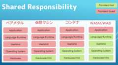 これは主にクラウドをイメージしたものですが、緑色がクラウドなどのベンダー、赤色が自分達です。物理サーバは全てを自分で管理する必要がり仮想サーバになるとOSより上が自分たちの責務になります。コンテナではユーザランドより上になり、WASM/WASI ではApplicationのみになります。もうlibcやopensslのバージョンを気にする必要は無いのです!