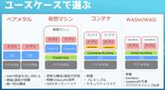 DBやビッグデータ基盤などは性能の出しやすいベアメタルが選択肢になりますし、仮想環境は最もニュートラルな選択肢であり続けるでしょう。ミドルウェアや従来型のアプリは依然コンテナが多いと思います。クラウドネイティブなアプリケーションはWASMが良いケースも多いですが、ネイティブの実行速度には一歩ゆずるケースもあるのでピーク性能を重視するならコンテナ、というケースもあるかもしれません。ツールの成熟で変わってくる部分も多いでしょうが、いずれにしても何らかの使い分けが必要になってきます。