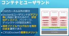 カーネルはホストと同一[5]になりますが、DebianでもFedoraでもAlpineでもゲストとして同時に実行する事が出来ます。VMでもリソースを柔軟に使う事は出来たのですがアプリケーションランタイムとしてみた場合にはアプリ毎にOSのリソースを消費して無駄が多く、起動時間等も相応にかかるのでテスト環境の自動払い出しやオートスケールでは実行のオーバーヘッドが大きかったのでそこにコンテナが上手くはまった形です。コンテナ毎にディストリやその中のディレクトリ構成やパッケージ構成を自由に作れたフレキシビリティも大きな魅力でした。