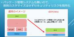 先ほど、ユーザランドを自由に弄れるのがDockerのメリットだと書きましたが、クラウドネイティブによりコンテナの中身がシンプルになった結果、デメリットの方が目立つようになります。